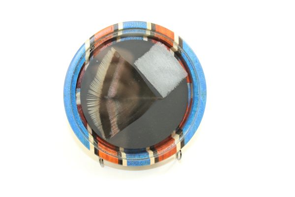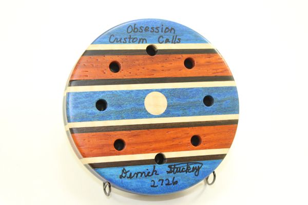 This Pot Call is Dyed Stabilized Spalted Maple/Padauk with Maple and Macassar Ebony stripes . The surface is Red Crystal, the soundboard is Glass. You will not find another call like this anywhere. Awesome looking and sounding call. The pictures do not do this call justice! You will not be disappointed. Comes with a 2 piece striker and a stone conditioner.