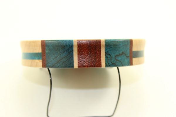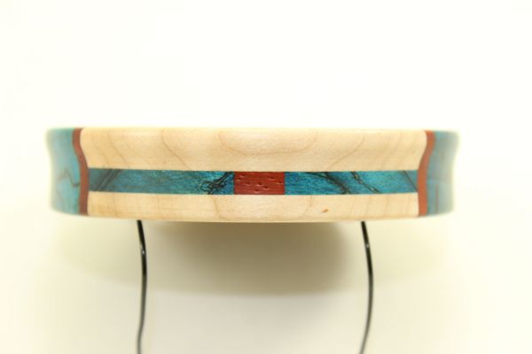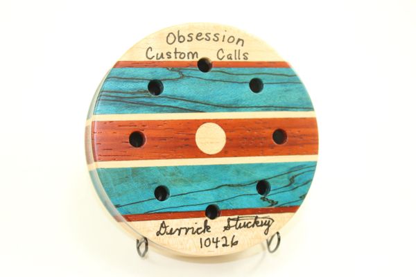 This Pot Call is Dyed Stabilized Spalted Maple/Padauk/Curly Maple . The surface is Crystal, the soundboard is Glass. You will not find another call like this anywhere. Check out the inlays on the sides. Awesome looking and sounding call. The pictures do not do this call justice! You will not be disappointed. YOU ARE BUYING THE CALL IN THE PICTURES. Comes with a 2 piece striker and a conditioner.