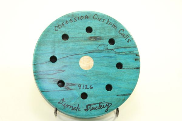 This Pot Call is Stabilized/Dyed Spalted Maple . The surface is Crystal, the soundboard is Glass. You will not find another call like this anywhere. Awesome looking and sounding call. The pictures do not do this call justice! You will not be disappointed. YOU ARE BUYING THE CALL IN THE PICTURES. Comes with a 2 piece striker and a conditioner.