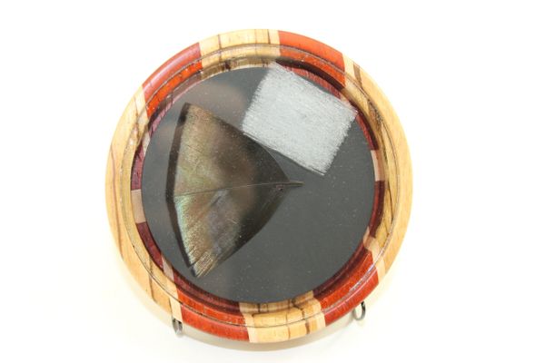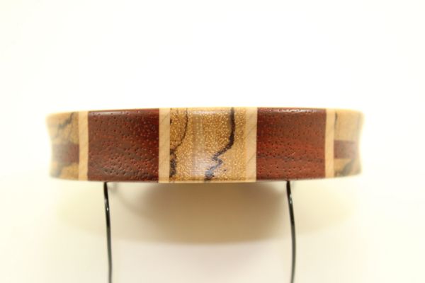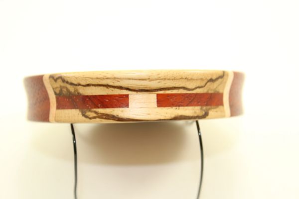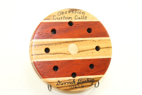 This Zebrawood/Padauk with Curly Maple stripes. The surface is Glass, the soundboard is Glass. You will not find another call like this anywhere. Check out the side inlays. I sold out of these in Nashville this year. You will not be disappointed. Comes with a 2 piece striker and a stone conditioner.